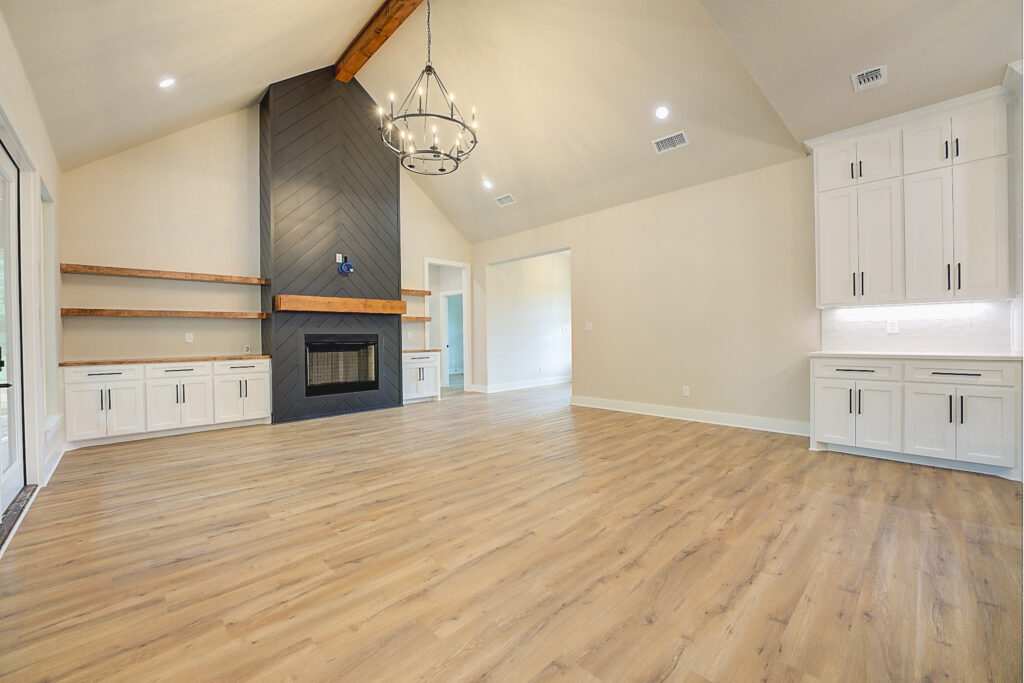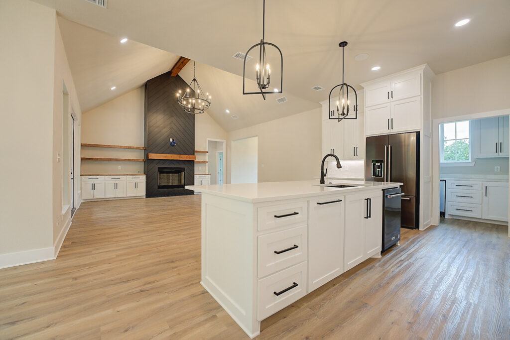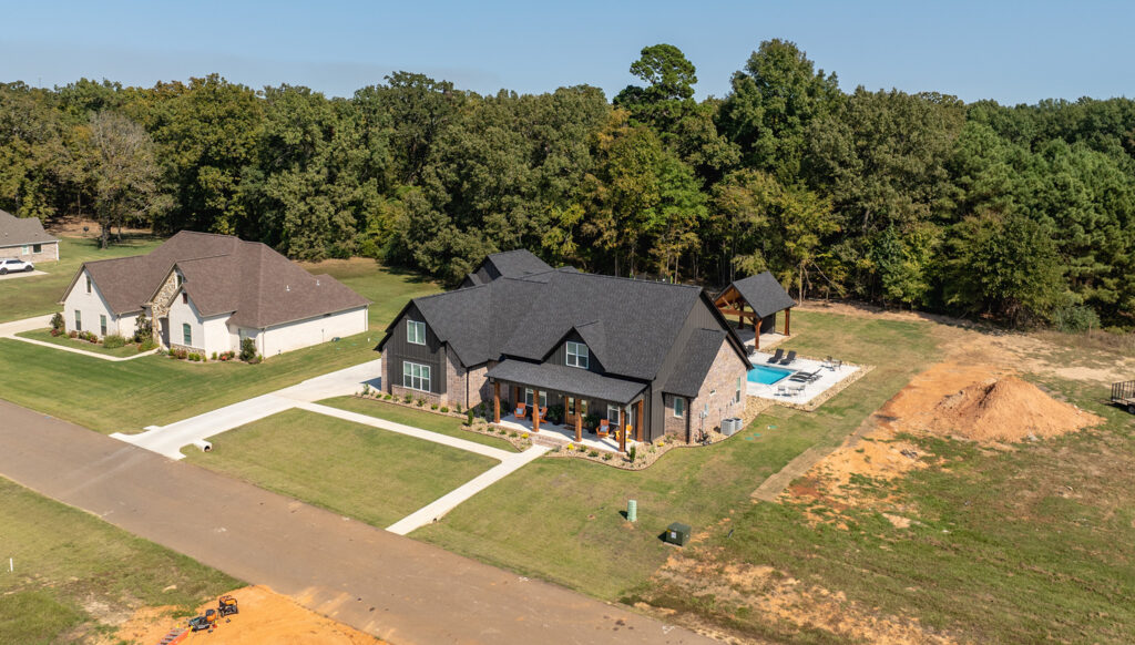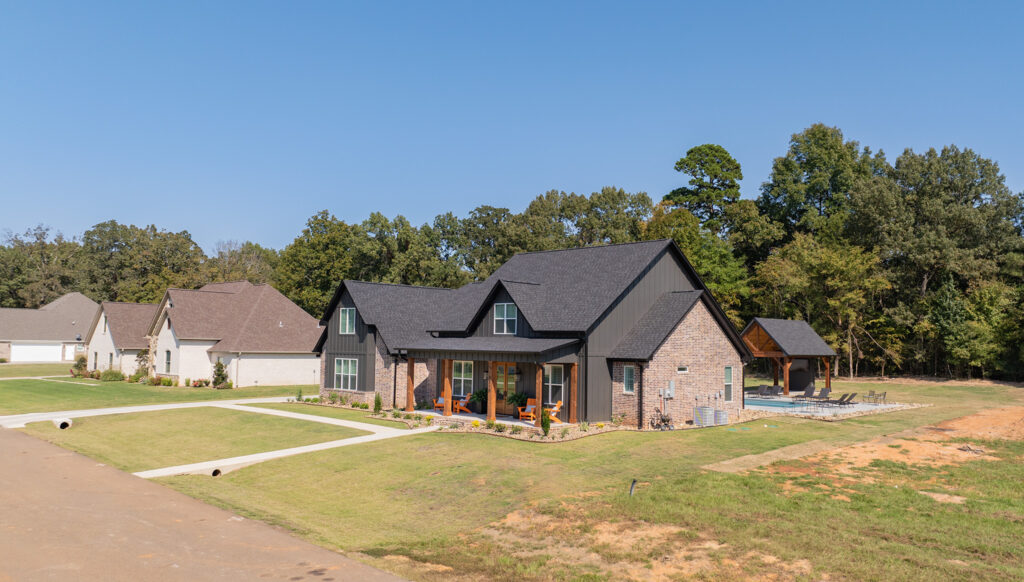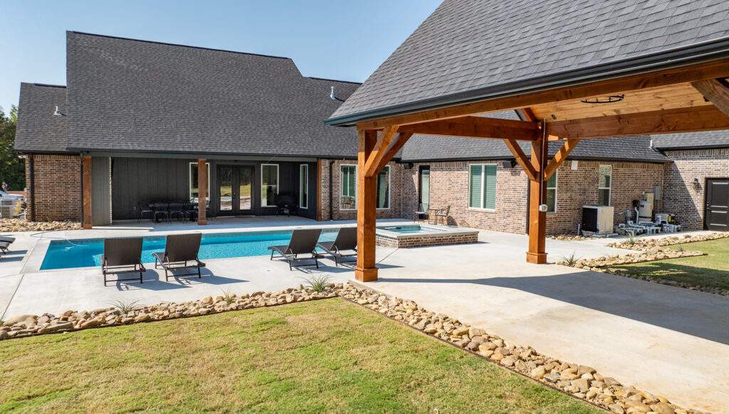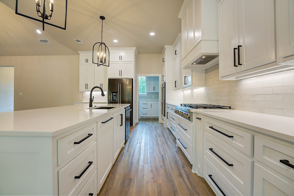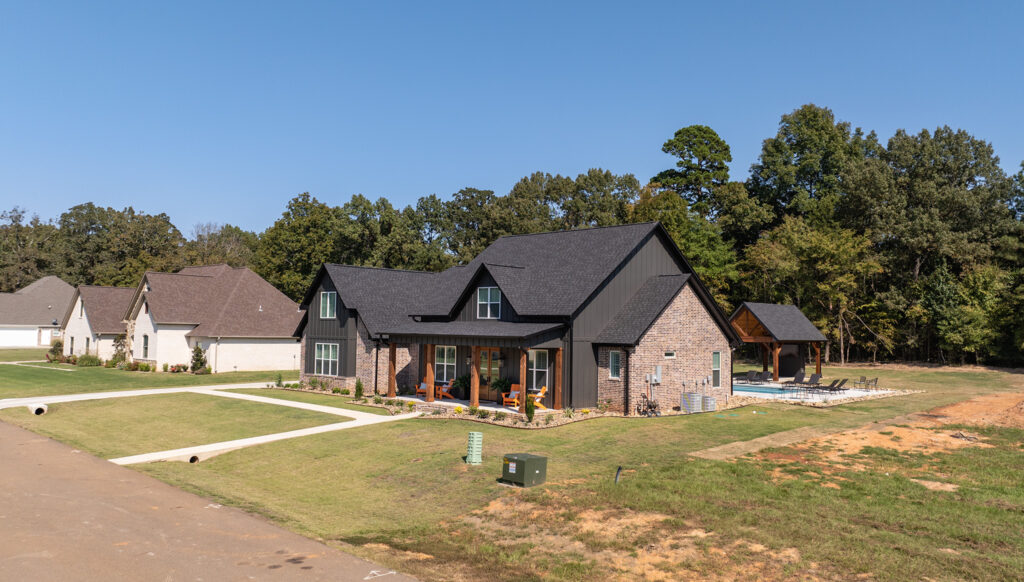 This stunning custom home blends classic brick craftsmanship with sleek modern finishes. The open-concept interior features elegant white cabinetry, warm wood flooring, and striking black accents throughout. From the spa-inspired master bath to the gourmet kitchen and spacious living area with custom shelving, every detail reflects quality and comfort. Outside, a private pool and covered patio create the perfect space for relaxing or entertaining — all wrapped in timeless design and superior construction.