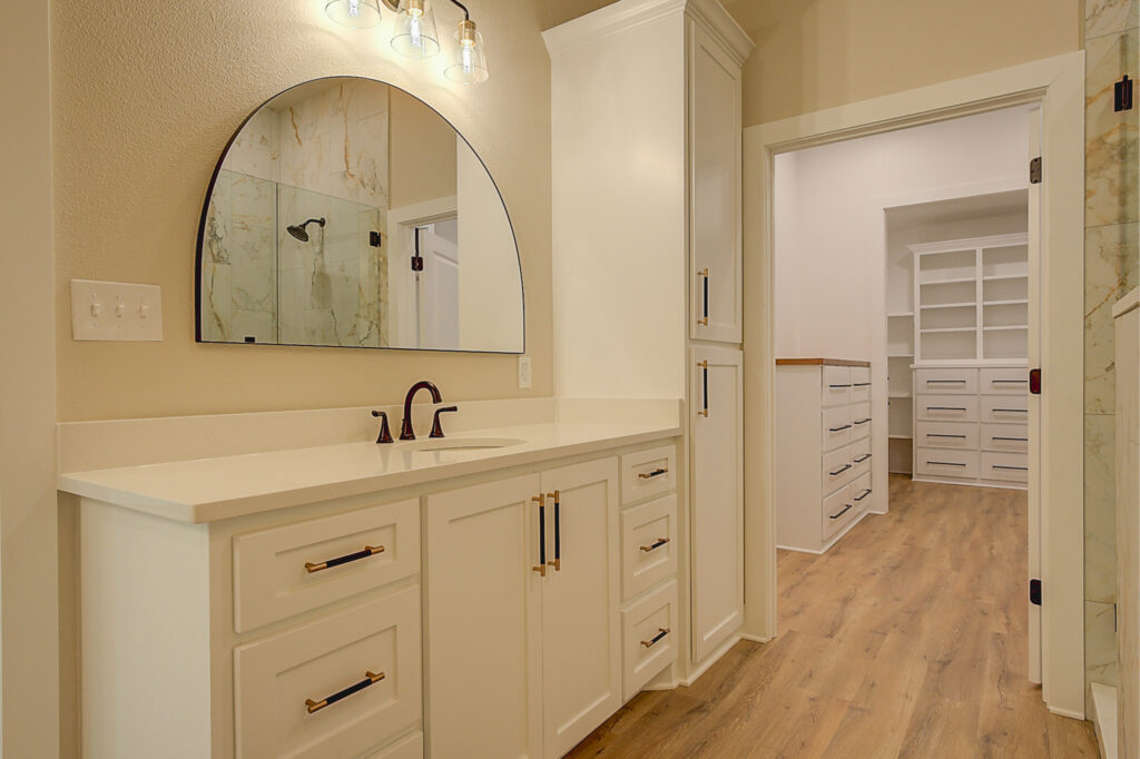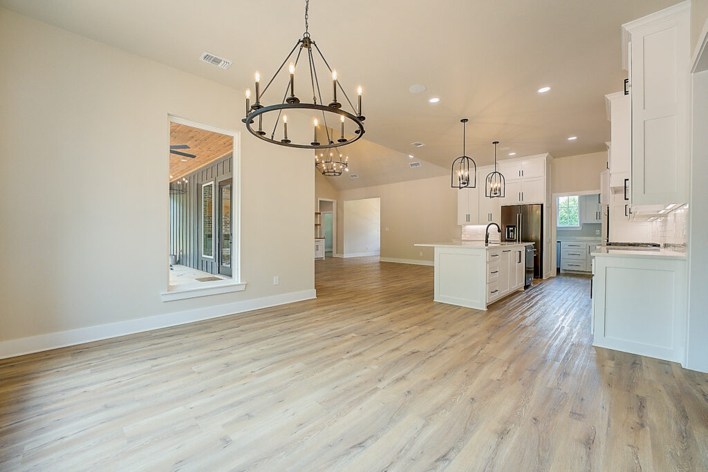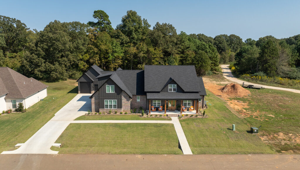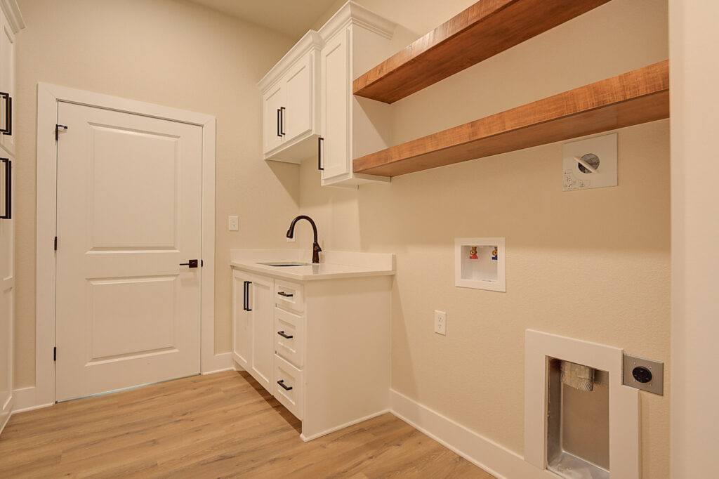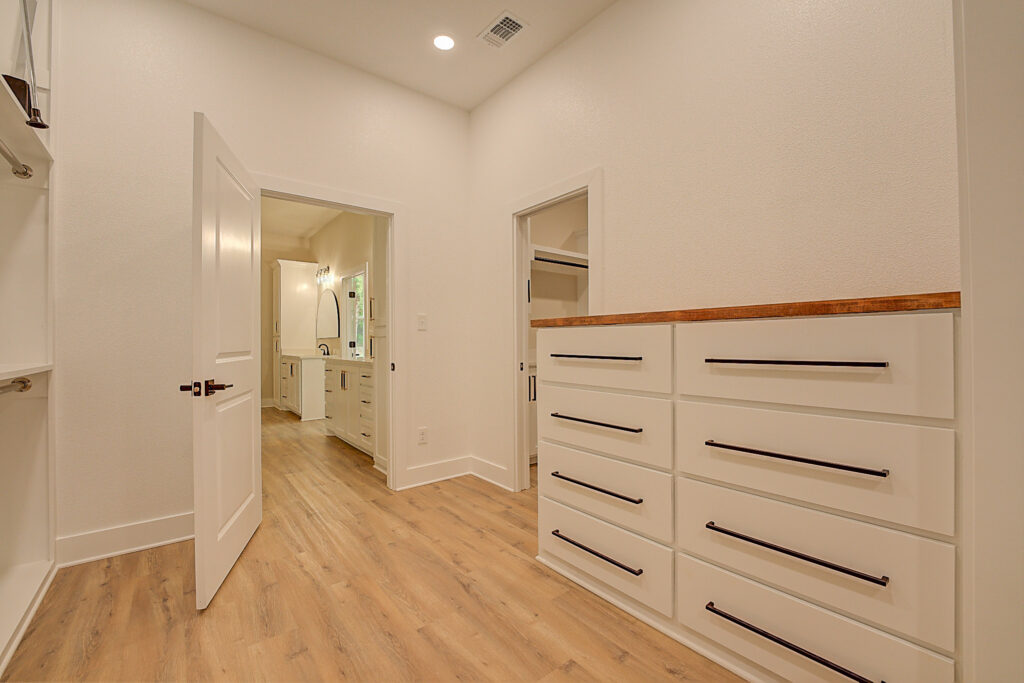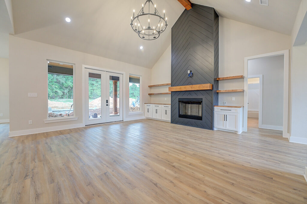 This stunning custom home blends classic brick craftsmanship with sleek modern finishes. The open-concept interior features elegant white cabinetry, warm wood flooring, and striking black accents throughout. From the spa-inspired master bath to the gourmet kitchen and spacious living area with custom shelving, every detail reflects quality and comfort. Outside, a private pool and covered patio create the perfect space for relaxing or entertaining — all wrapped in timeless design and superior construction.