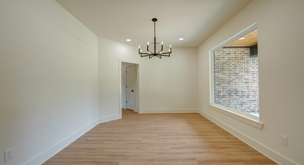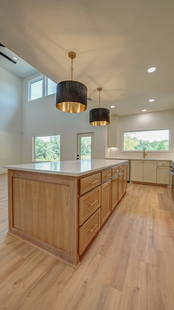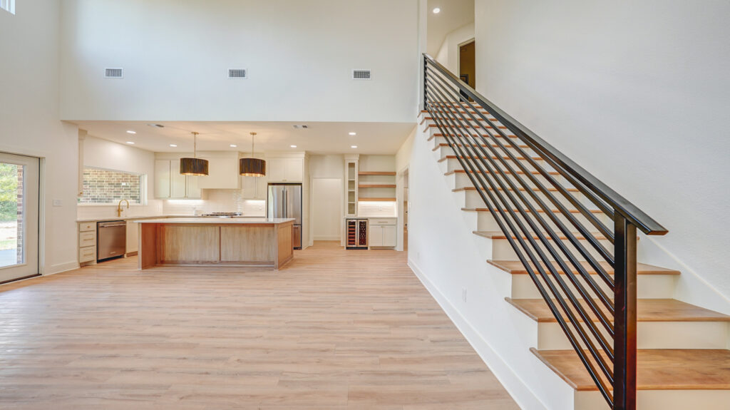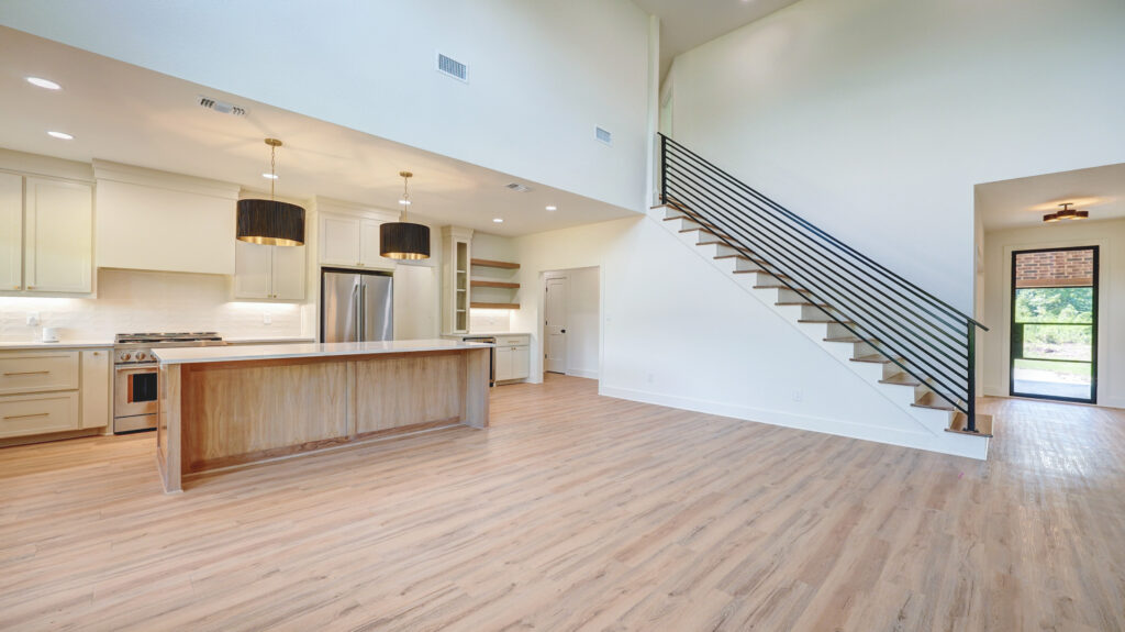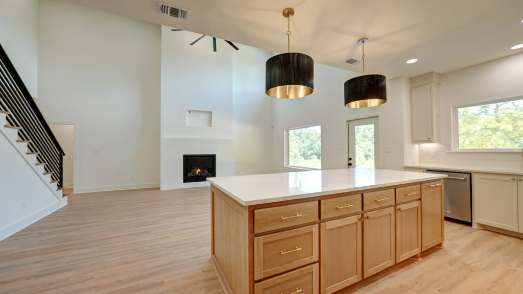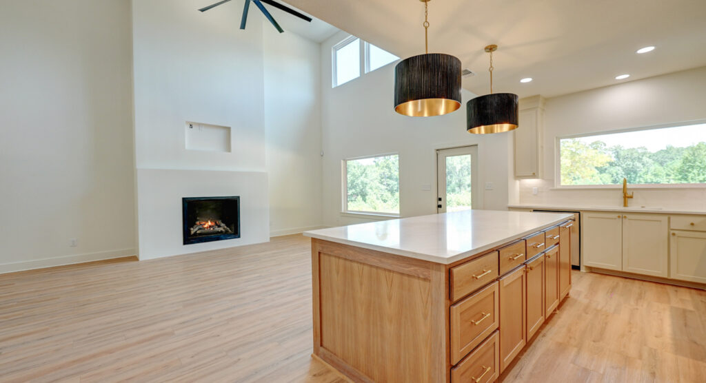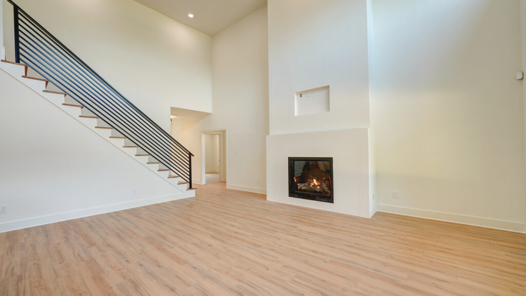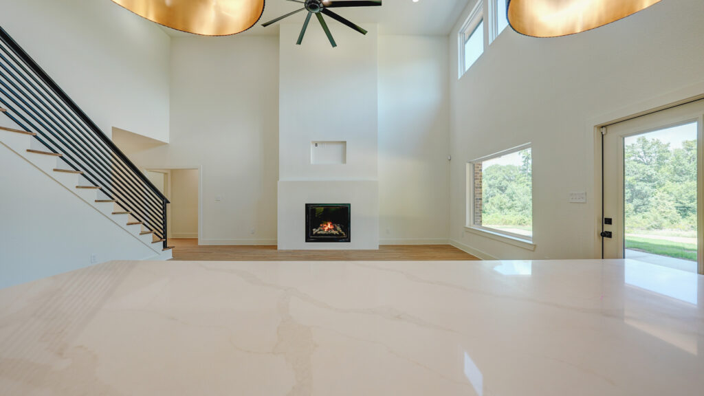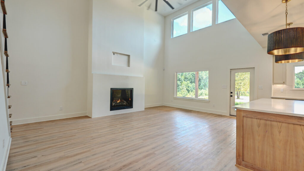 The home’s open layout connects the living room, kitchen, and dining area seamlessly, featuring high ceilings, a statement fireplace, and natural light that makes the space feel expansive yet welcoming.