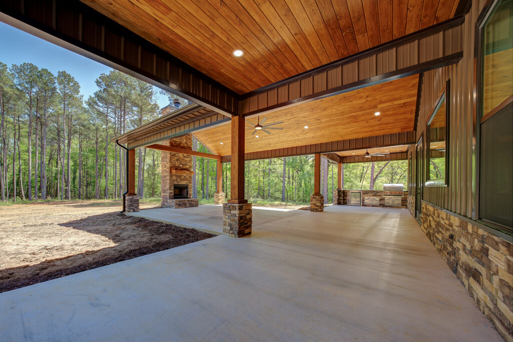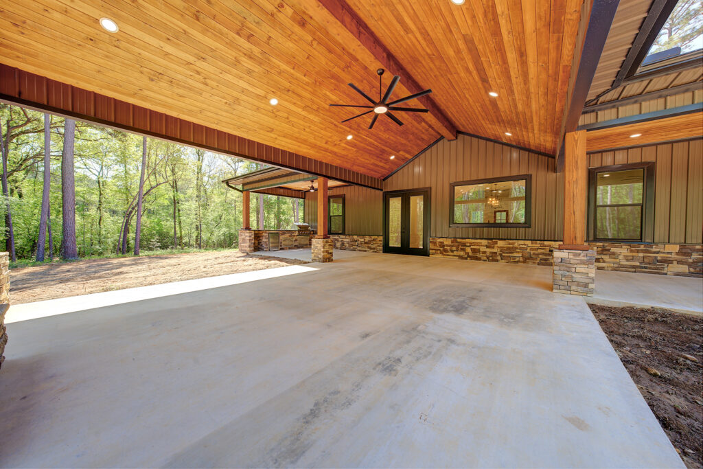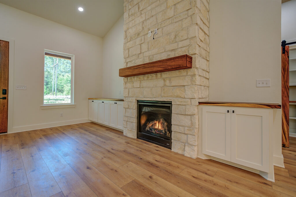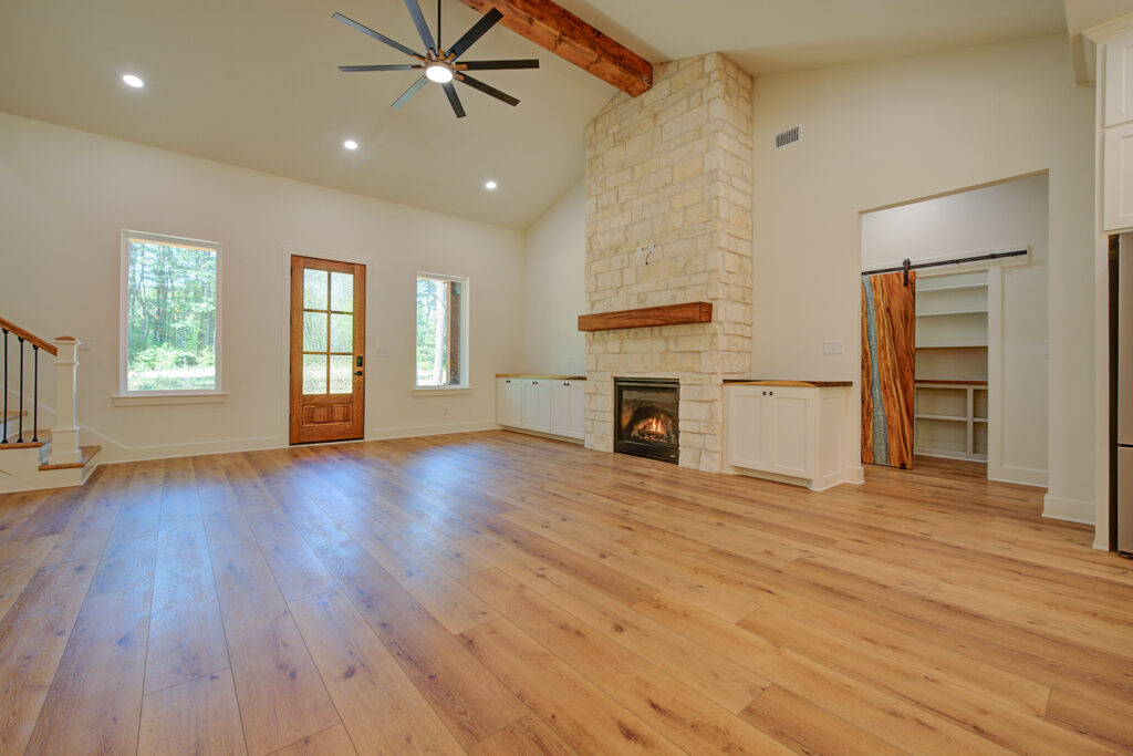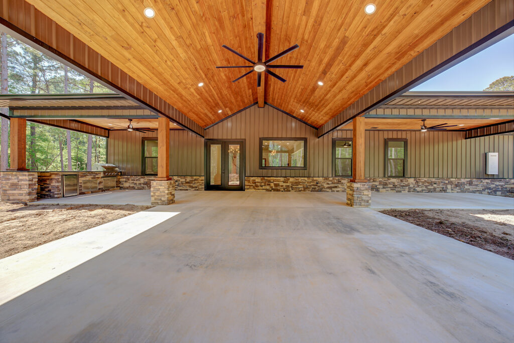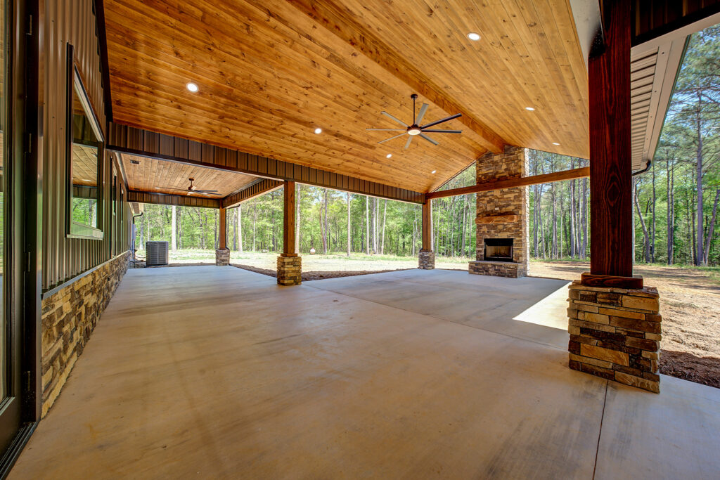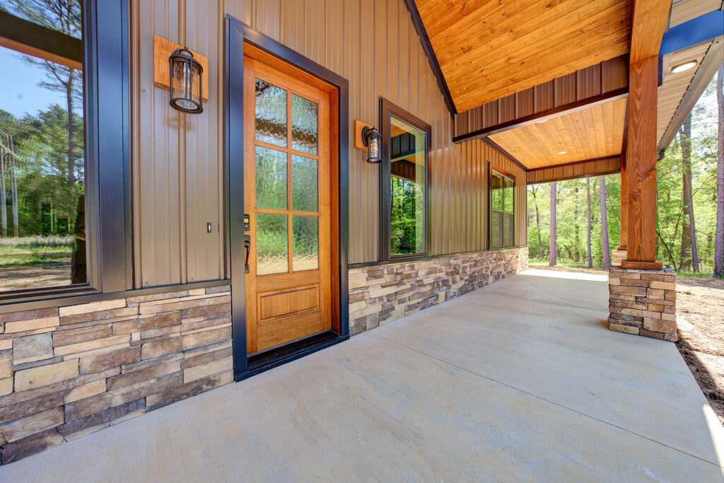The stunning stone archway dividing the kitchen and living areas, dramatic two-story foyer with custom arched door, and extensive covered porches with natural wood ceilings create unforgettable first impressions that set this home apart from typical new construction.