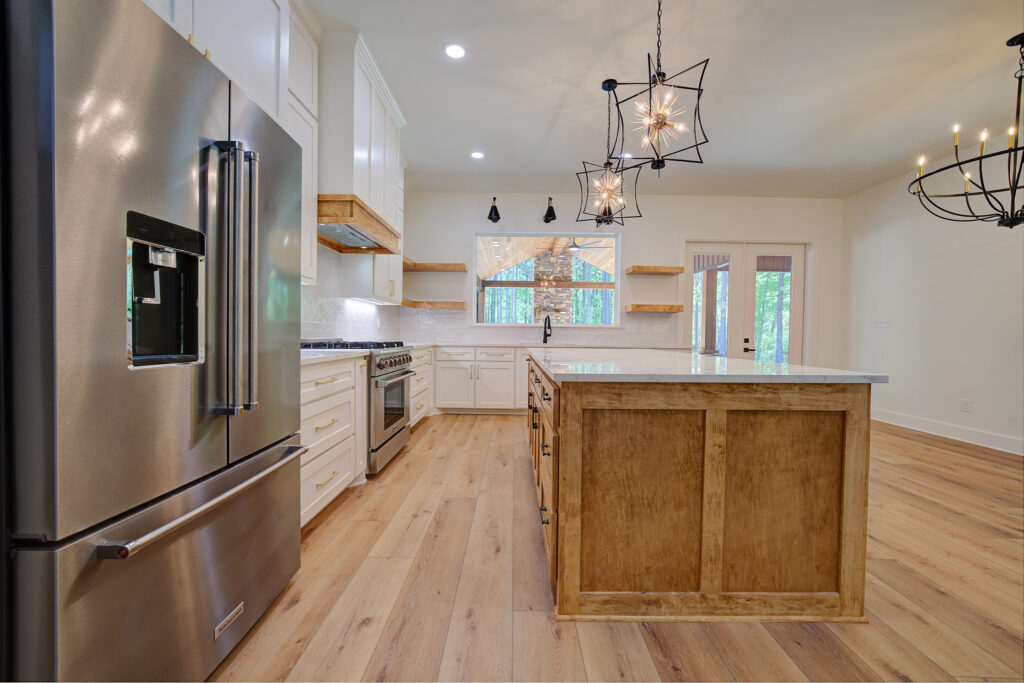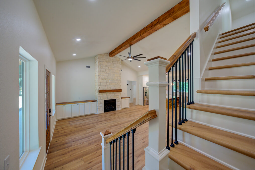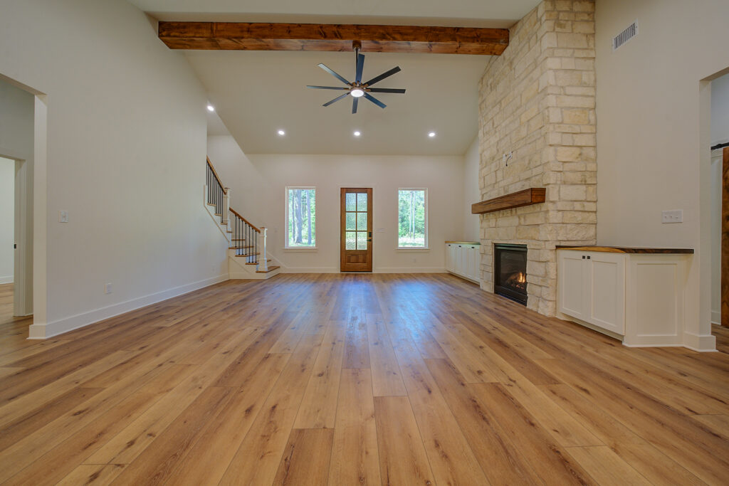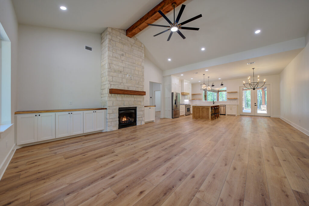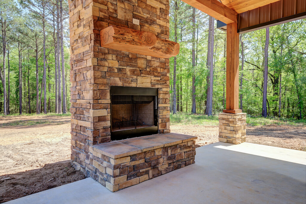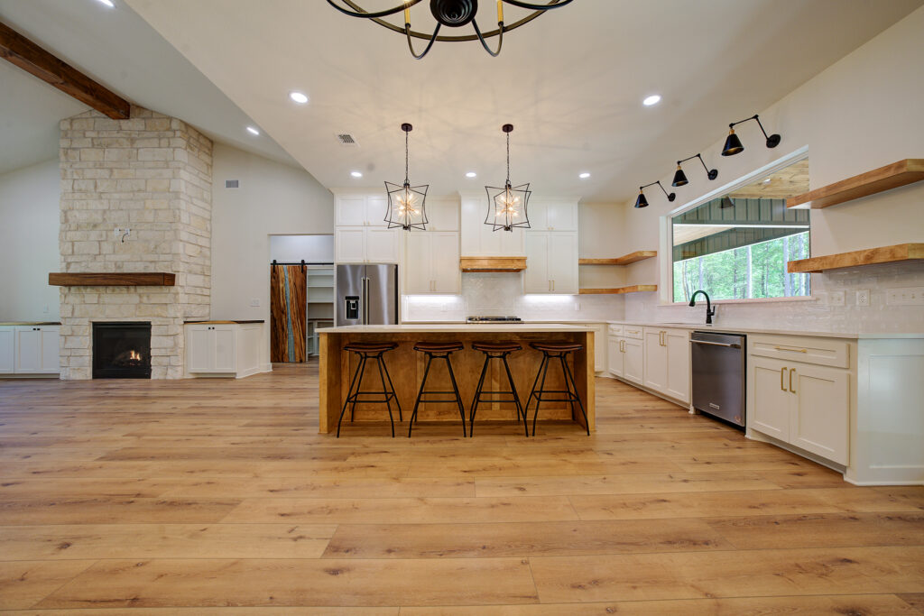 The stunning stone archway dividing the kitchen and living areas, dramatic two-story foyer with custom arched door, and extensive covered porches with natural wood ceilings create unforgettable first impressions that set this home apart from typical new construction.
