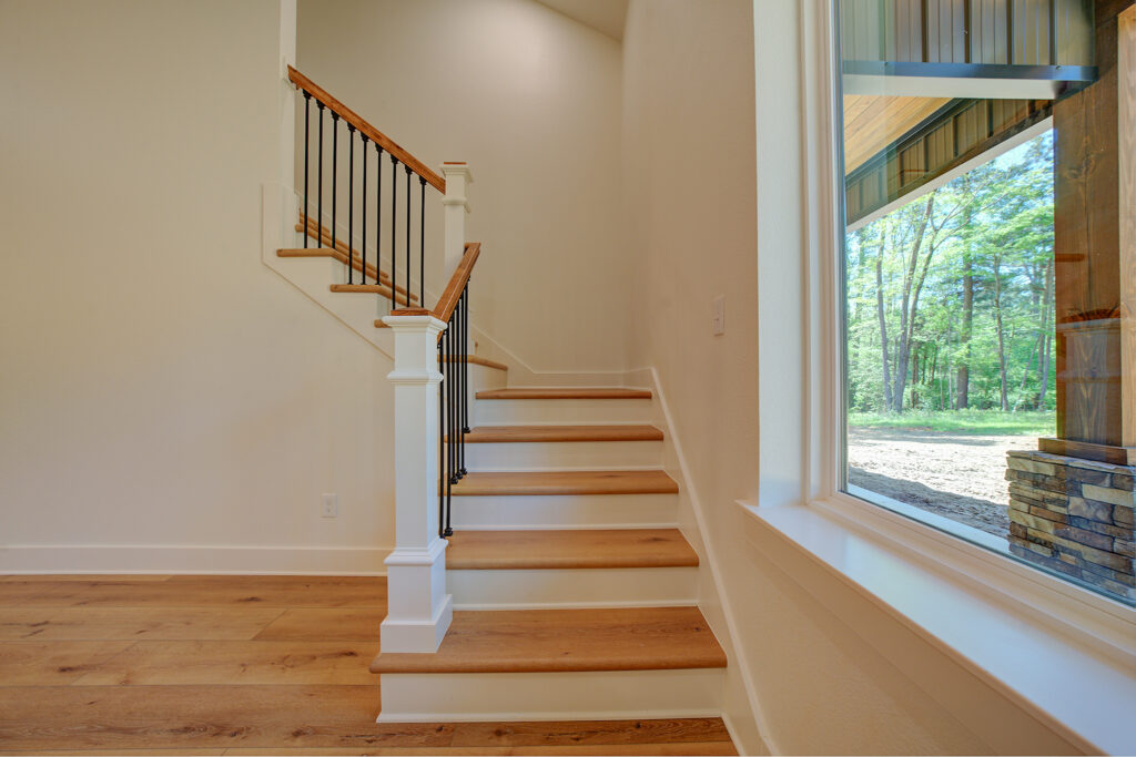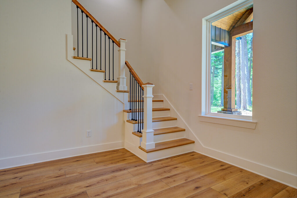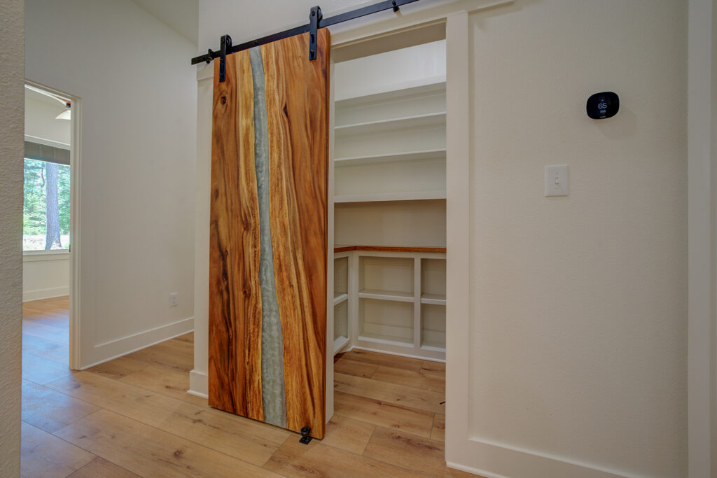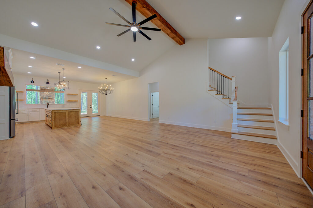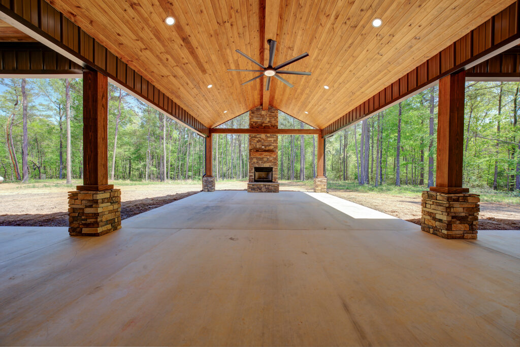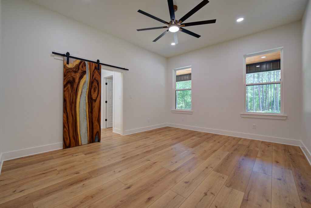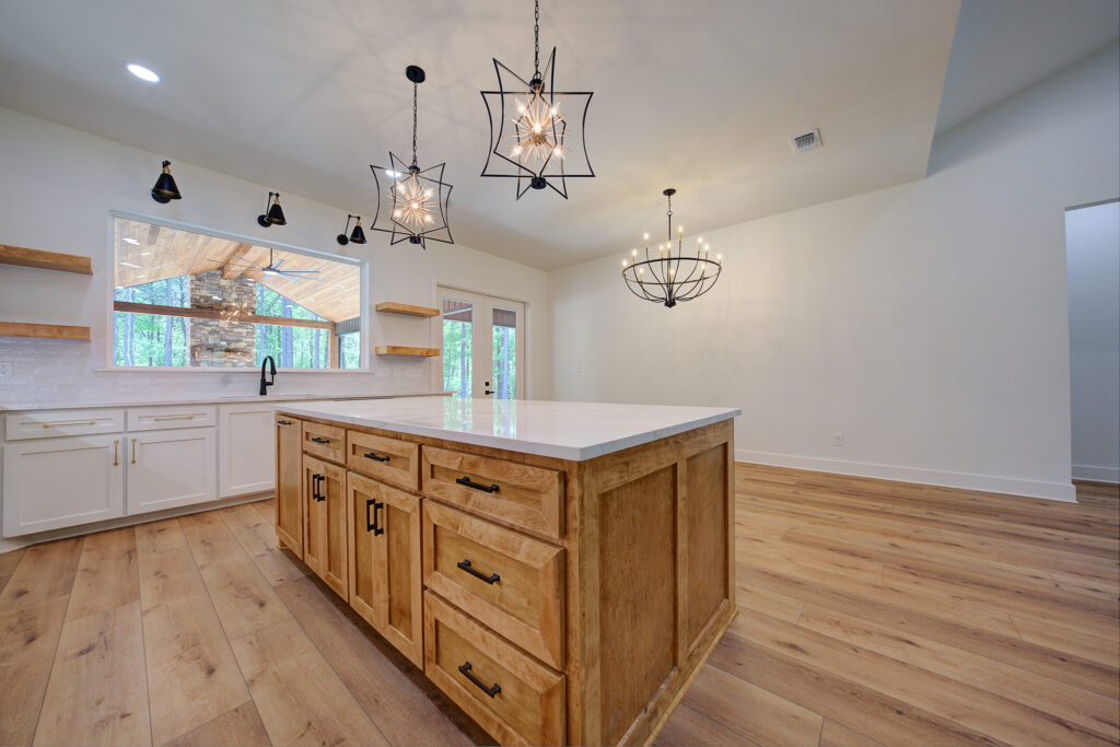 The stunning stone archway dividing the kitchen and living areas, dramatic two-story foyer with custom arched door, and extensive covered porches with natural wood ceilings create unforgettable first impressions that set this home apart from typical new construction.
