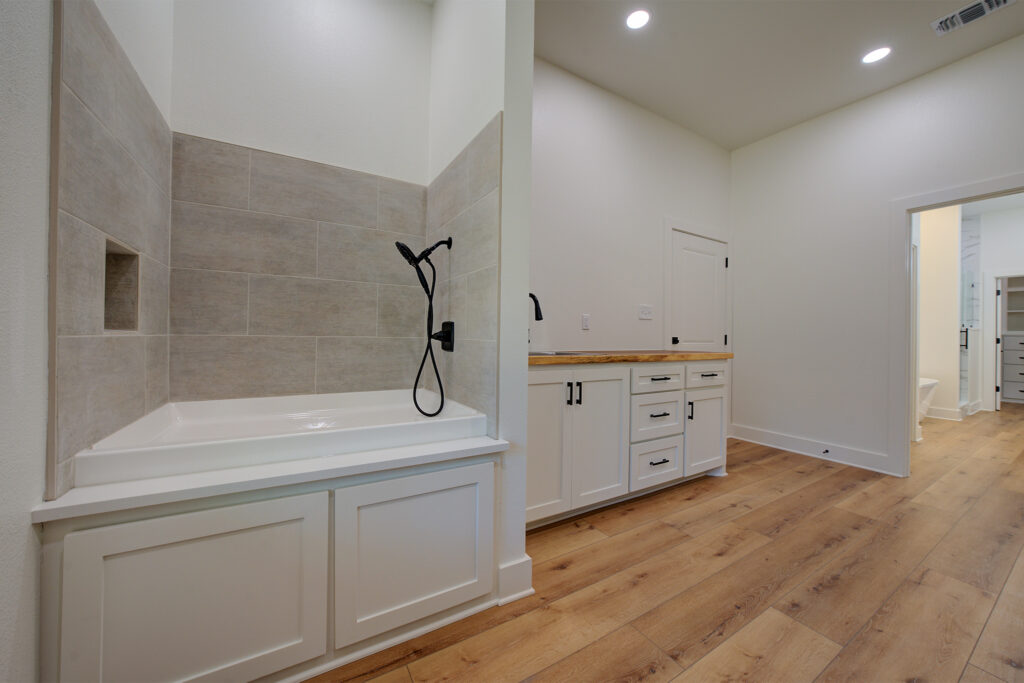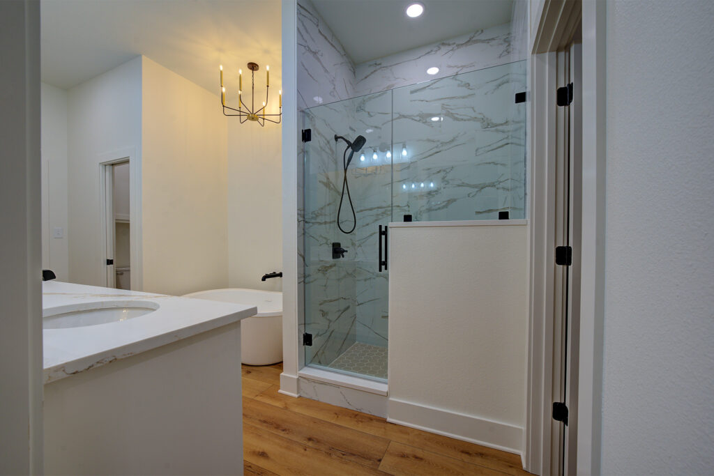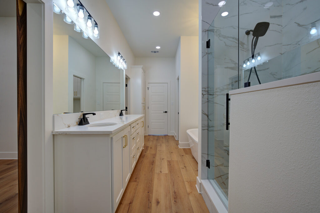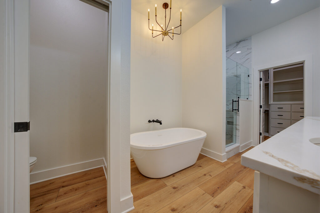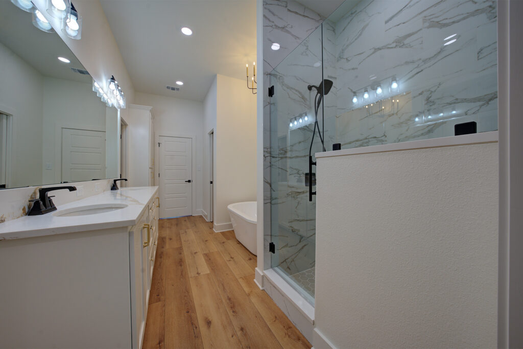 From the spa-inspired master bath with freestanding tub and floor-to-ceiling marble tile to the custom cabinetry throughout (including pull-out drawers, window seats with storage, and a butler's pantry with stone accent wall), no expense was spared in delivering premium finishes and thoughtful functionality.