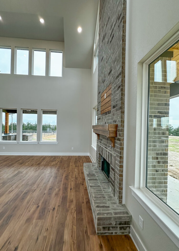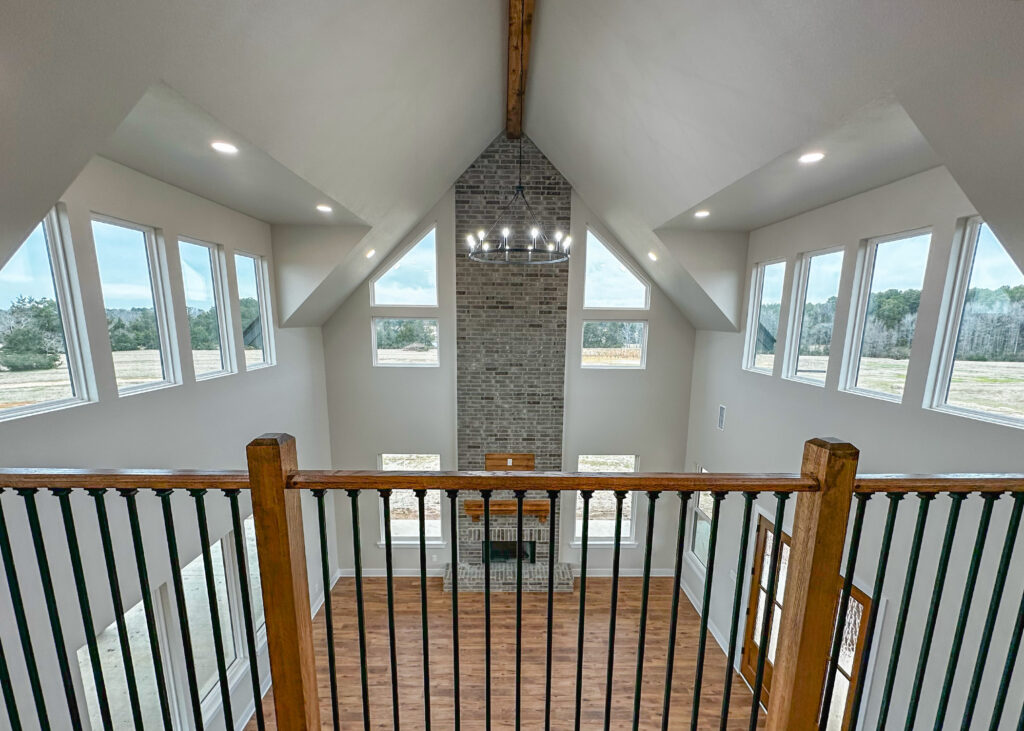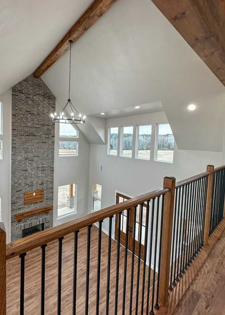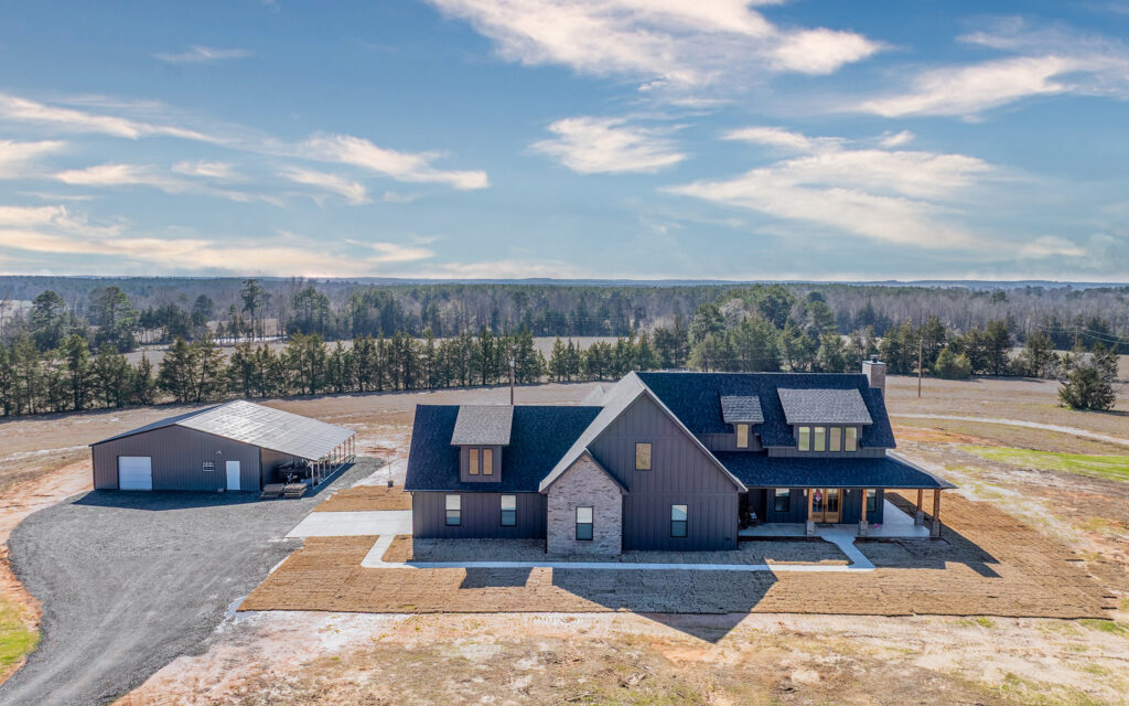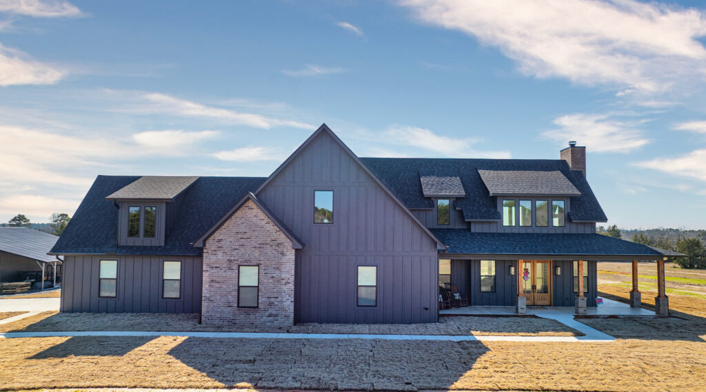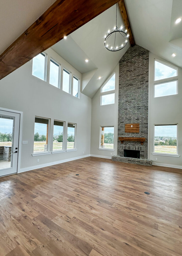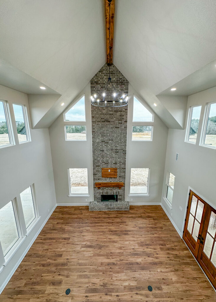 This stunning custom home showcases expert craftsmanship and timeless design. Featuring bold exterior lines, warm brick and wood accents, and a welcoming wrap-around porch, it perfectly balances modern sophistication with country comfort. Inside, the open-concept layout highlights soaring ceilings, natural light, and elegant finishes—from the grand stone fireplace and exposed beams to the spa-inspired bath and gourmet kitchen with custom cabinetry and floating shelves. Every detail reflects thoughtful design and quality construction built to stand the test of time.