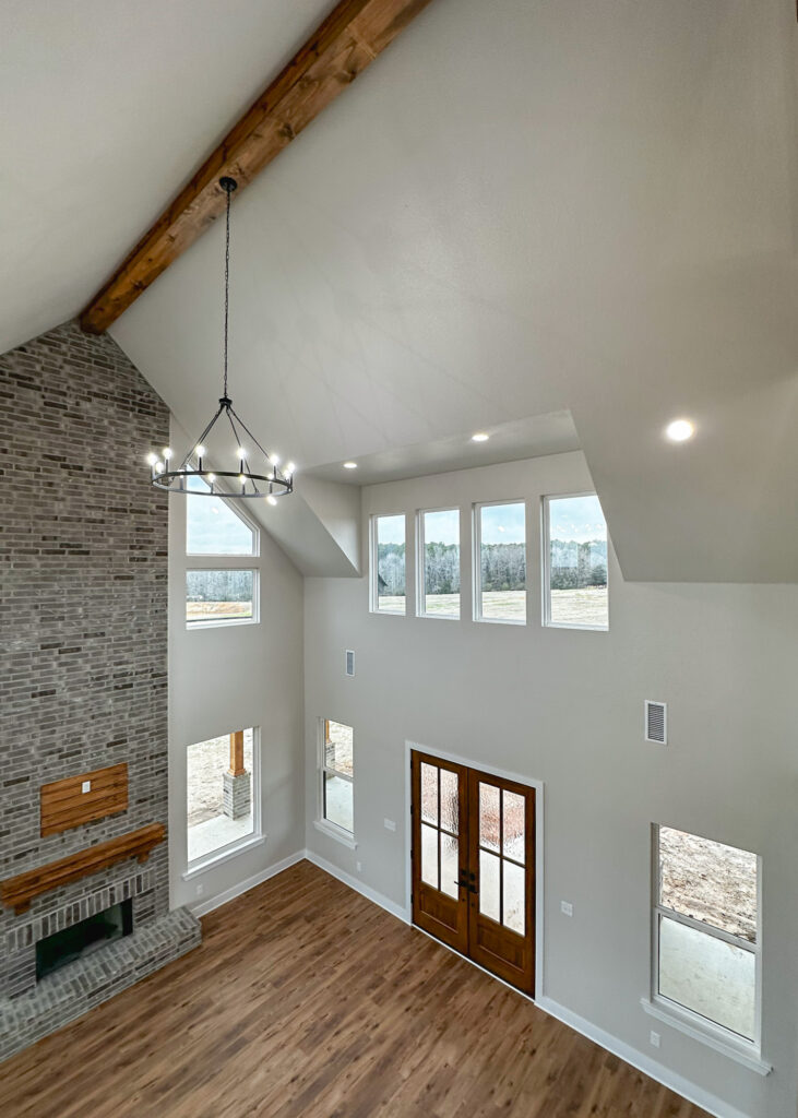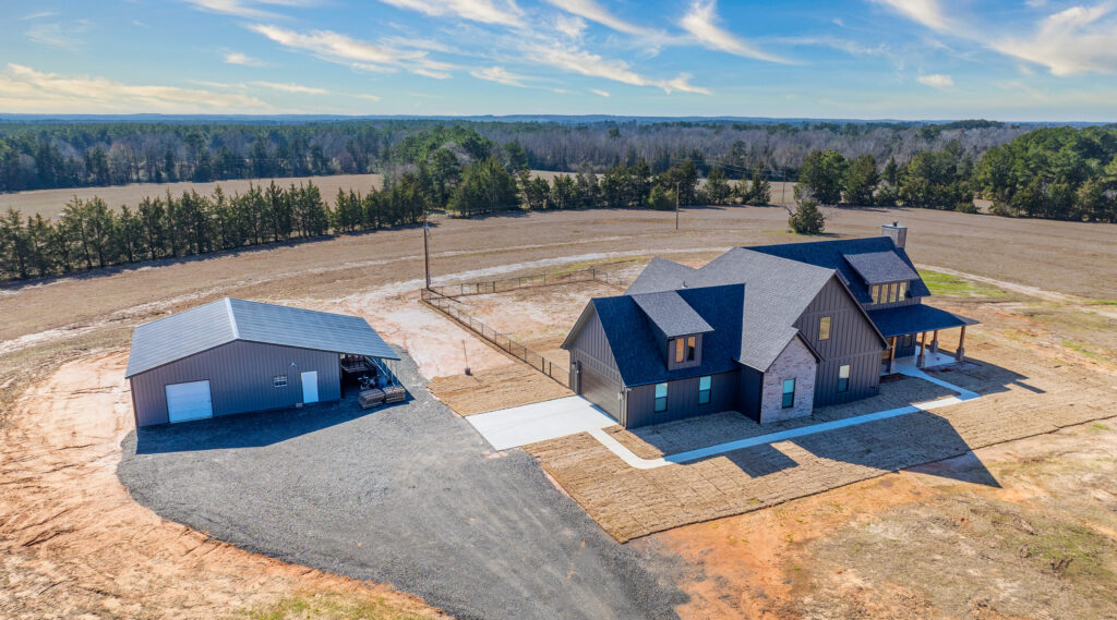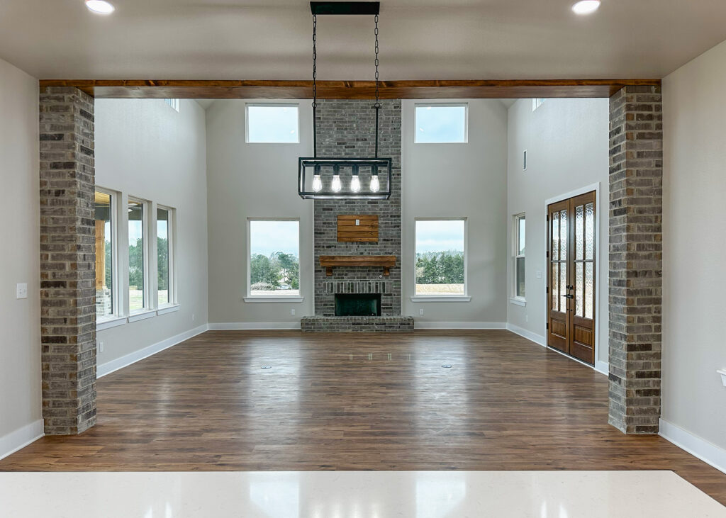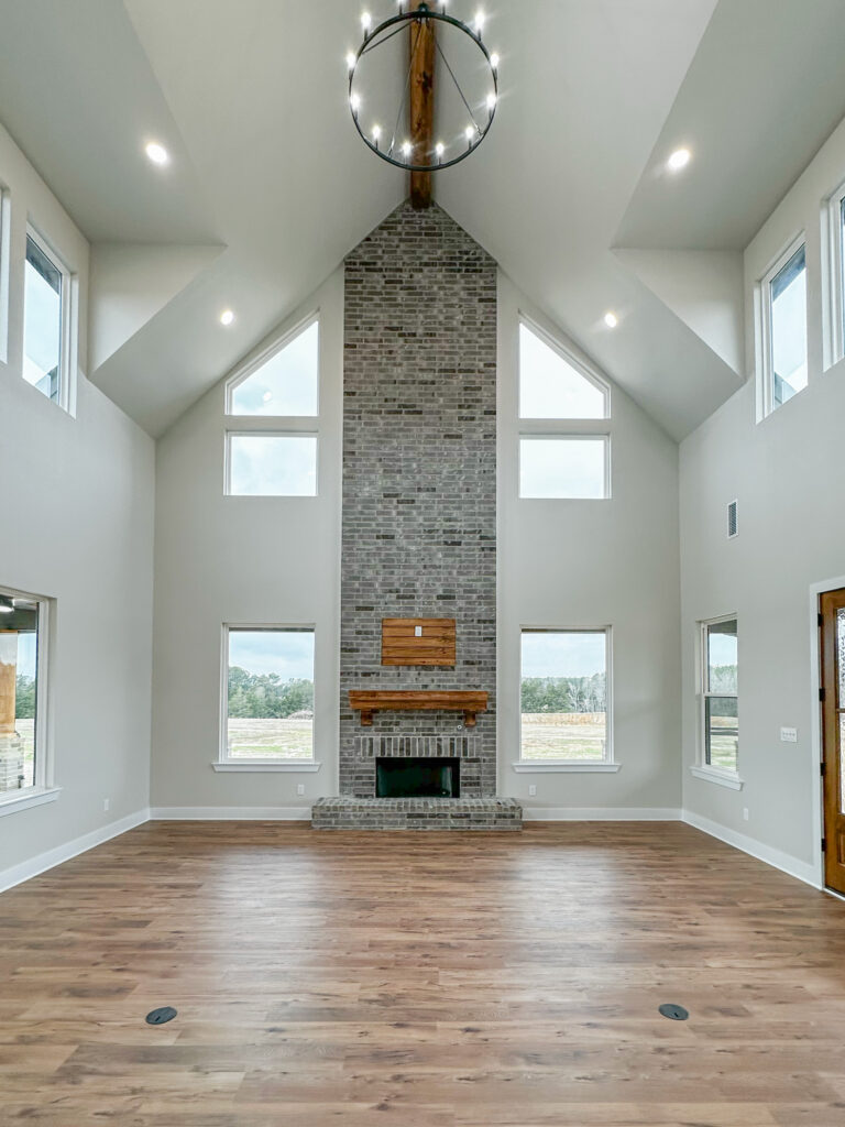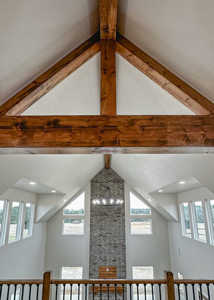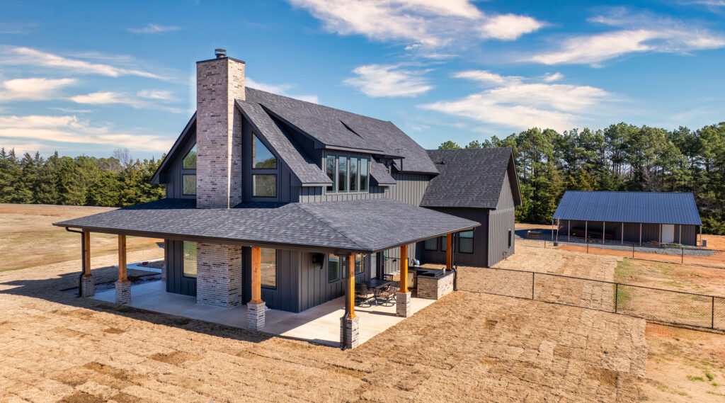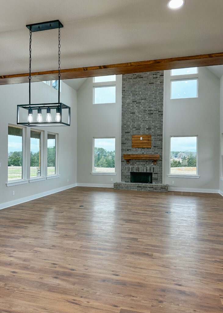 This stunning custom home showcases expert craftsmanship and timeless design. Featuring bold exterior lines, warm brick and wood accents, and a welcoming wrap-around porch, it perfectly balances modern sophistication with country comfort. Inside, the open-concept layout highlights soaring ceilings, natural light, and elegant finishes—from the grand stone fireplace and exposed beams to the spa-inspired bath and gourmet kitchen with custom cabinetry and floating shelves. Every detail reflects thoughtful design and quality construction built to stand the test of time.