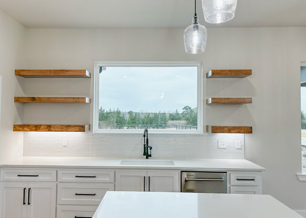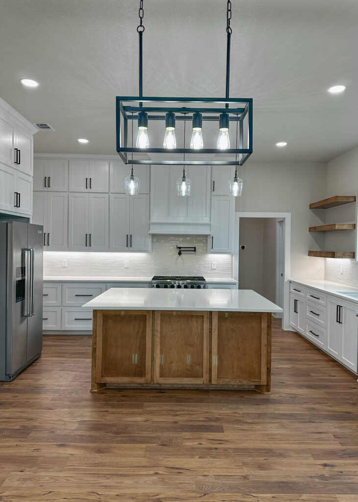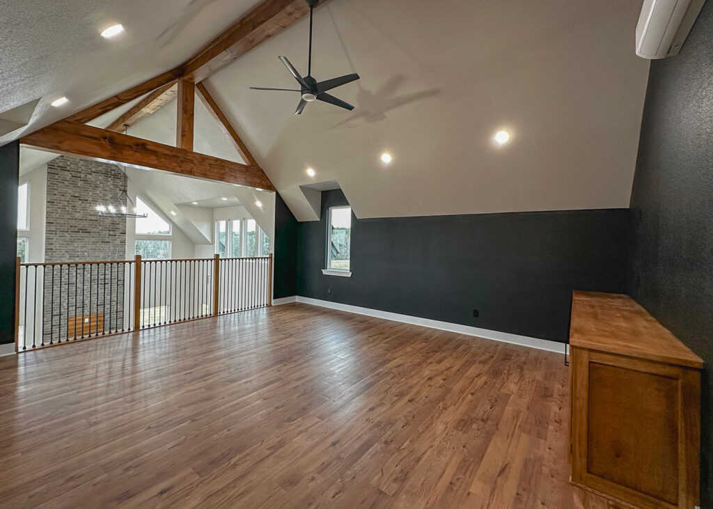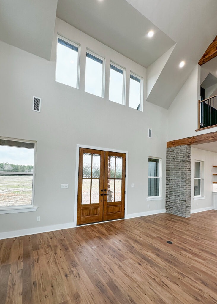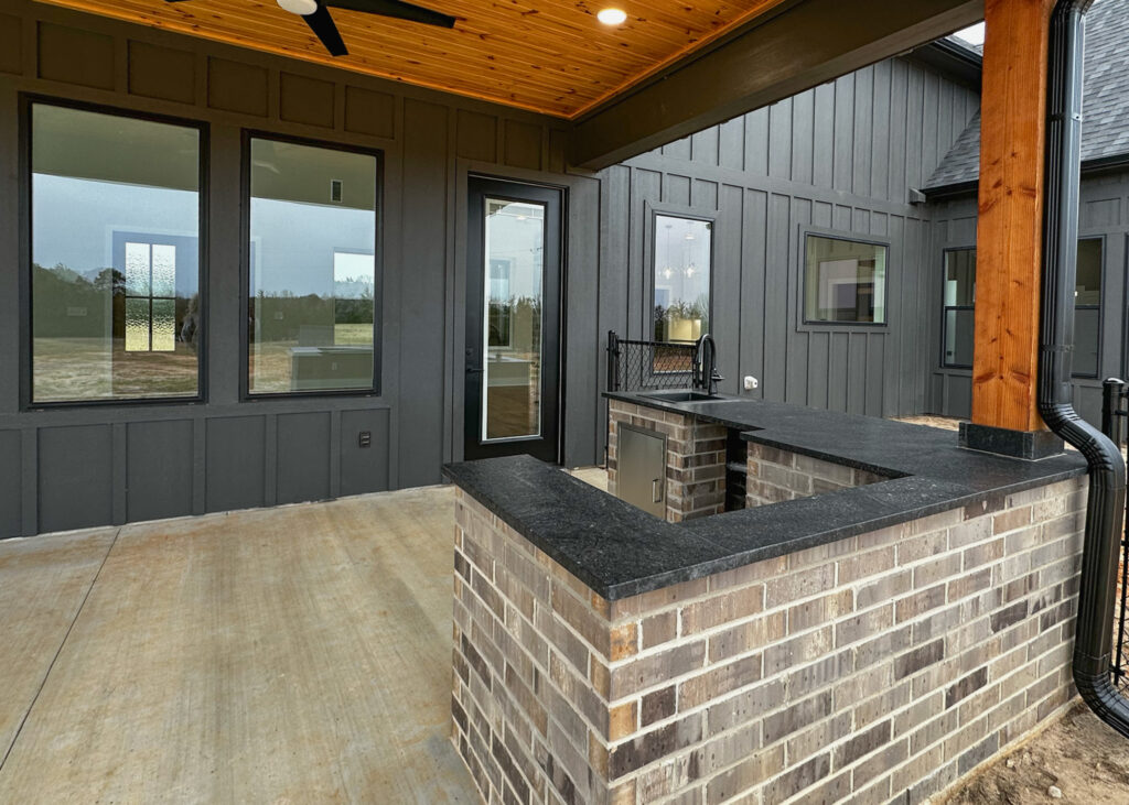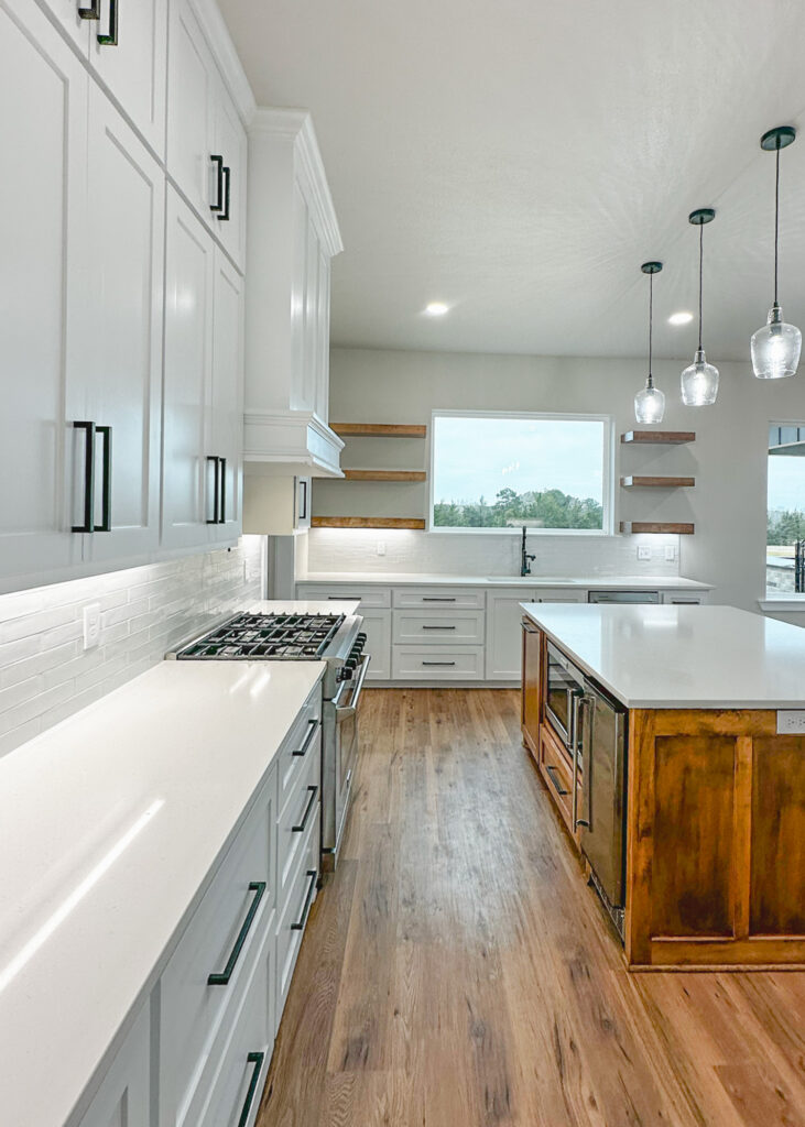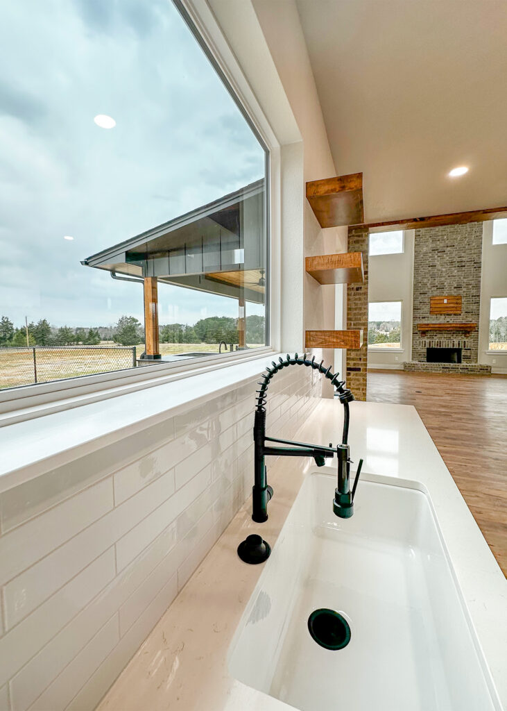 This stunning custom home showcases expert craftsmanship and timeless design. Featuring bold exterior lines, warm brick and wood accents, and a welcoming wrap-around porch, it perfectly balances modern sophistication with country comfort. Inside, the open-concept layout highlights soaring ceilings, natural light, and elegant finishes—from the grand stone fireplace and exposed beams to the spa-inspired bath and gourmet kitchen with custom cabinetry and floating shelves. Every detail reflects thoughtful design and quality construction built to stand the test of time.