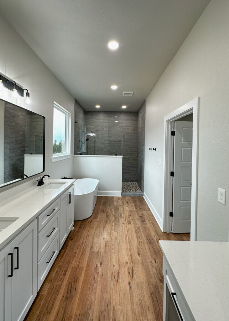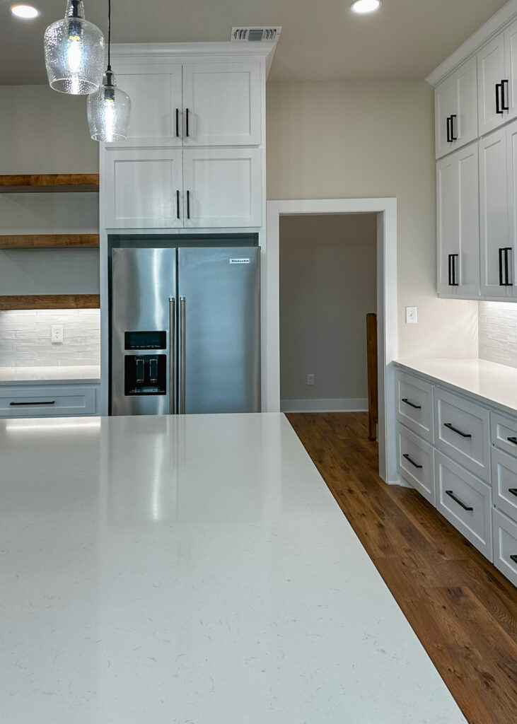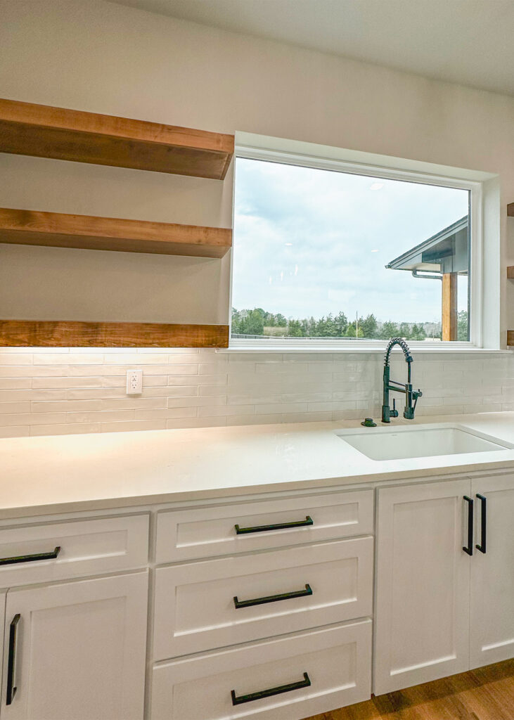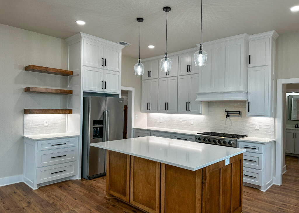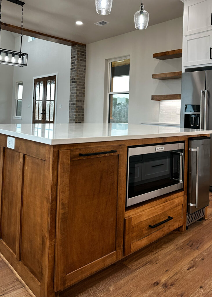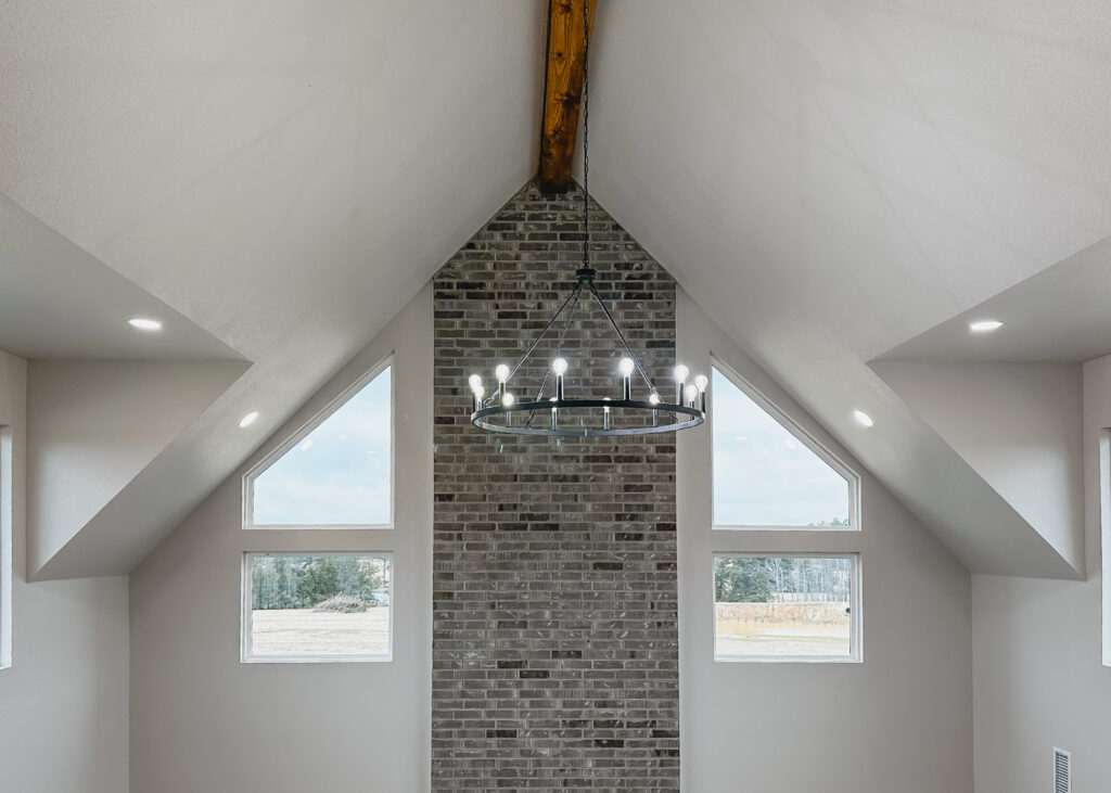 This stunning custom home showcases expert craftsmanship and timeless design. Featuring bold exterior lines, warm brick and wood accents, and a welcoming wrap-around porch, it perfectly balances modern sophistication with country comfort. Inside, the open-concept layout highlights soaring ceilings, natural light, and elegant finishes—from the grand stone fireplace and exposed beams to the spa-inspired bath and gourmet kitchen with custom cabinetry and floating shelves. Every detail reflects thoughtful design and quality construction built to stand the test of time.